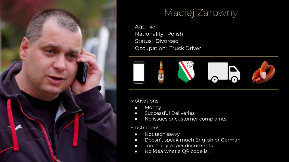 We created user personas for the drivers. From our interviews and research, we realized that although the other people involved in the process tend to be Austrian or German, the drivers are normally middle-age men from Eastern Europe. We mapped their journeys during a normal cargo shipment and identified some of the major pain points related to transactions and documentation.